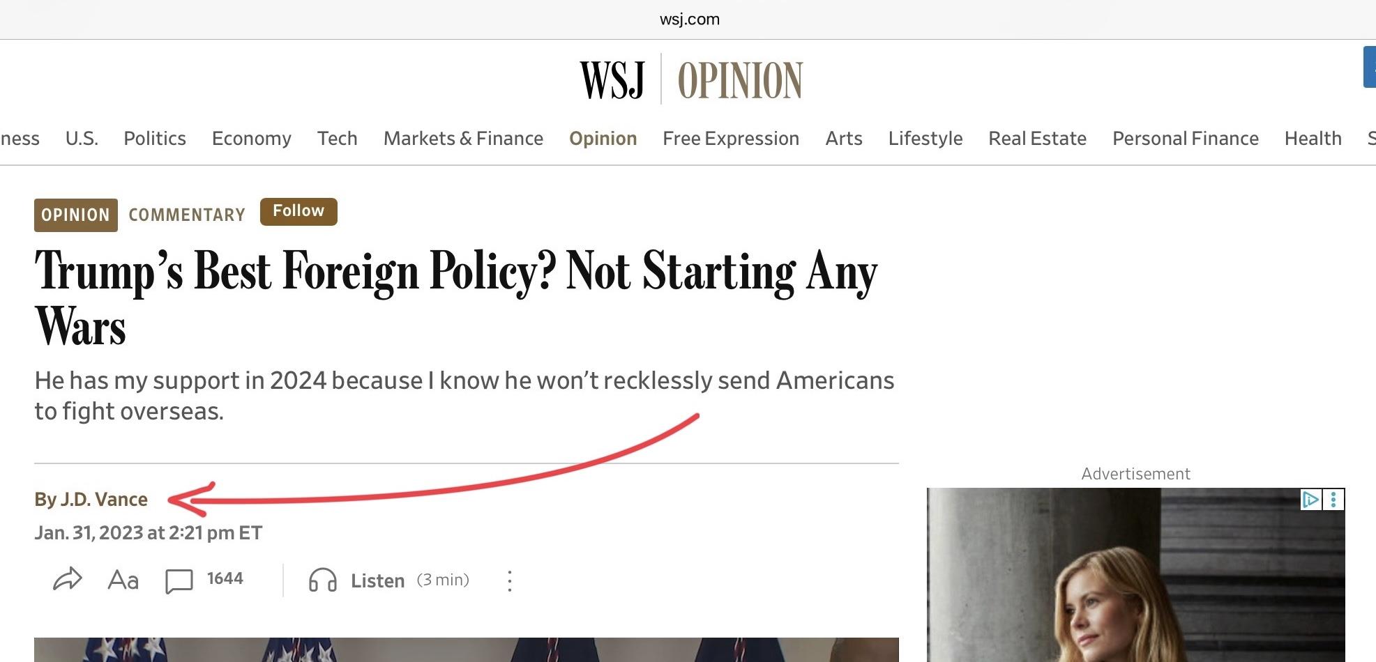 - what: screenshot of a 2023/01/31 Wall Street Journal opinion piece by J.D. Vance expressing support for Donald Trump "because I know he won't recklessly send Americans to fight overseas"