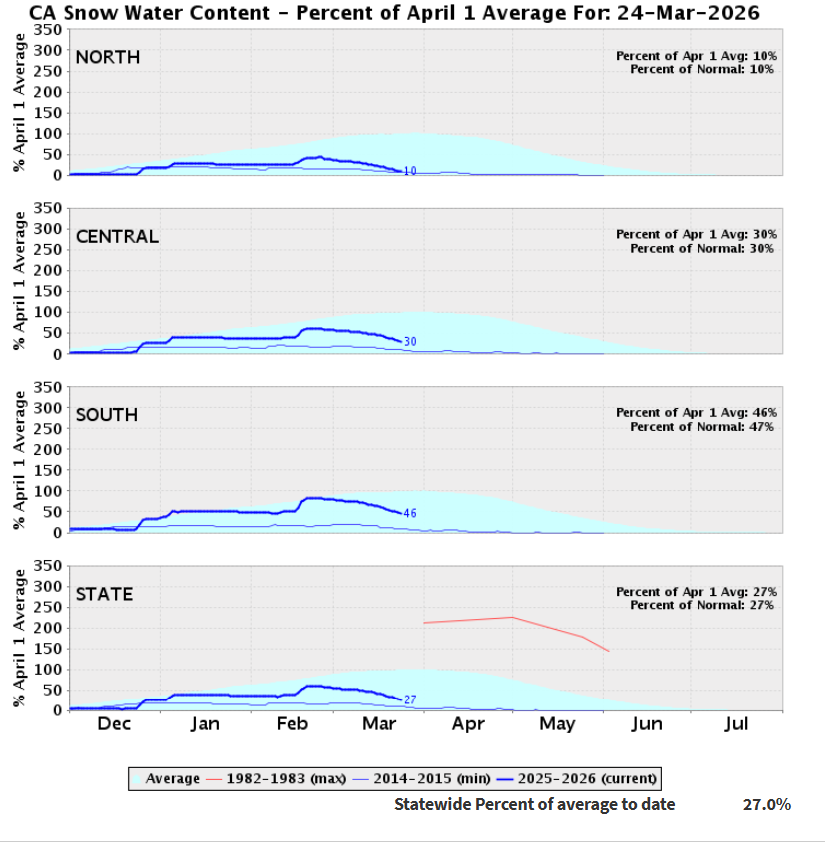 - what: three graphs showing California snow water content for 2026/03/24