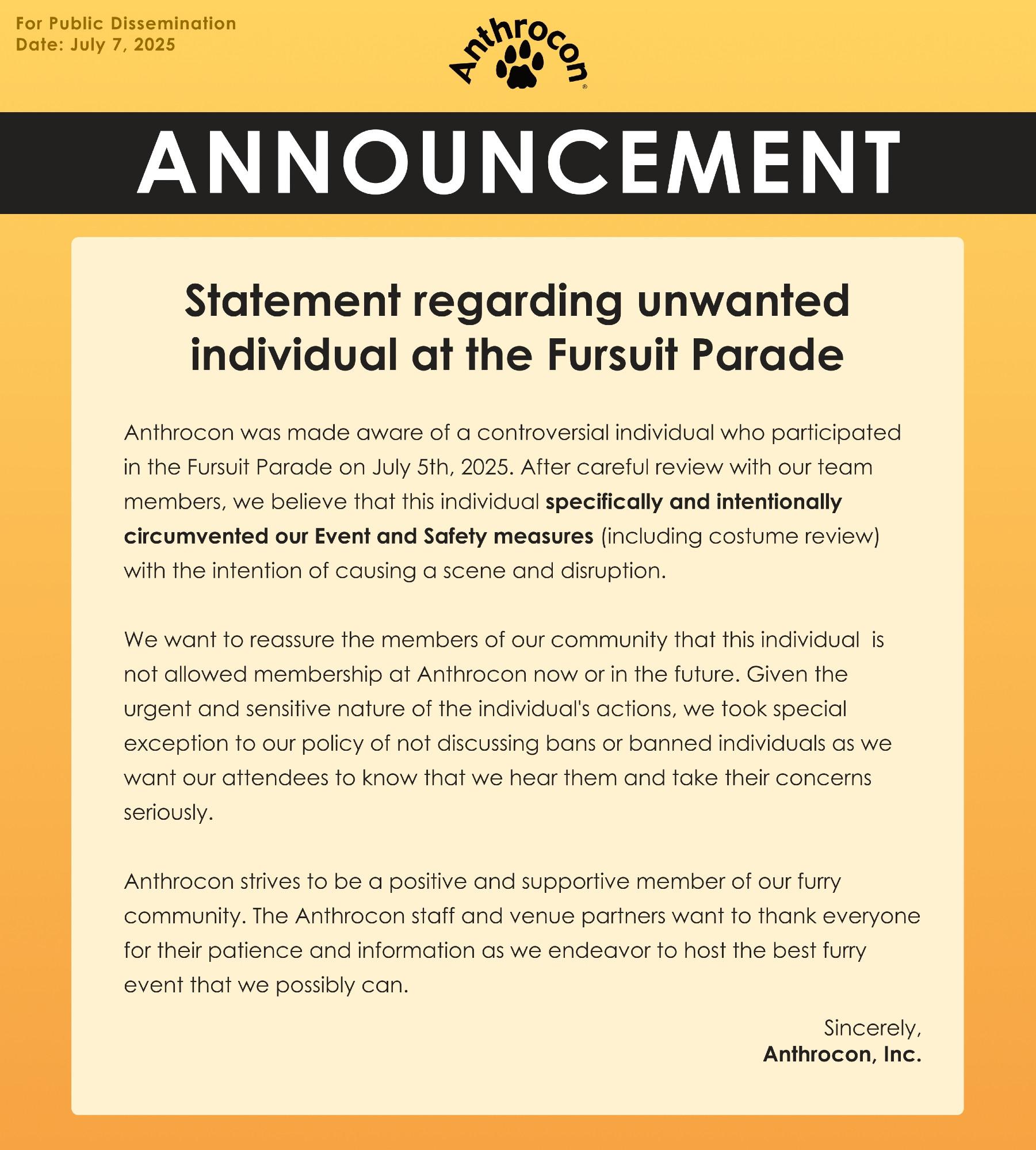 - what: statement from AnthroCon about the accidental admission of Crusader Cat